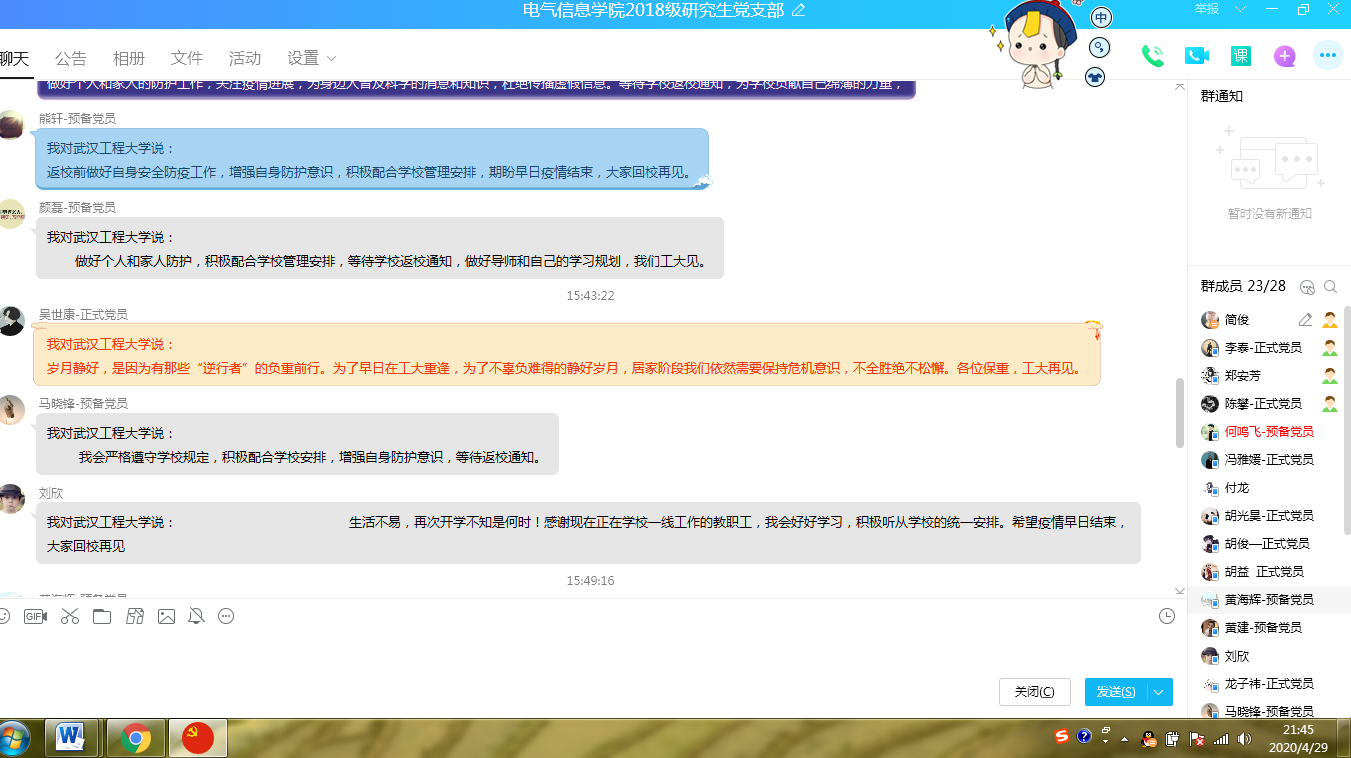 活动最后,各学生党支部结合支部实际情况开展了特色讨论活动。2018级研究生党支部通过支部QQ群以“我对我校说”的方式来丈量对学校的思念,助力即将到来的“全面胜利”。电子信息学生党支部针对“你最牵挂的宿舍宝贝”进行了广泛讨论。“我最牵挂宿舍的奖状”、“我最想念我的小伙伴”、“我最放心不下我的书籍”、“我还挺想见见老师的”……大家抒发了思念校园、思念同学、思念教师之情。