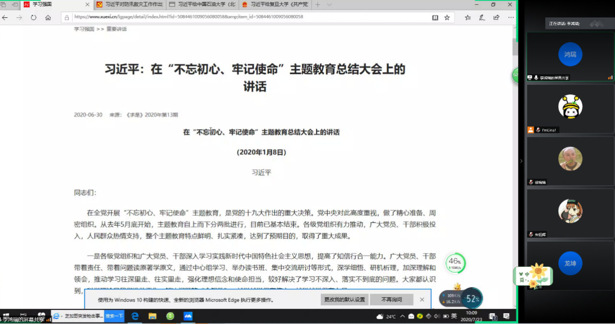 学生党支部重点学习了习近平总书记给中国石油大学(北京)克拉玛依校区毕业生的回信精神、习近平总书记给复旦大学青年师生党员回信精神以及习近平总书记关于防汛救灾工作作出的重要指示精神。两个研究生党支部通过学习习近平总书记给中国石油大学(北京)克拉玛依校区毕业生的回信精神,党员同志们深受鼓舞,尤其是即将步入毕业年级的研究生党员谈到习近平总书记在回信中提到受疫情影响,2020届高校毕业生经受了磨练、收获了成长,也体会到了“志不求易者成,事不避难者进”的道理。我们作为2021届毕业生,也要不畏艰难险阻,勇担时代使命,发扬奋斗精神,把个人的理想追求融入党和国家事业之中,为党、为祖国、为人民多作贡献。本科生党支部认真学习习近平总书记回信精神后,还延伸学习了《共产党宣言》部分章节内容,学生党员们纷纷表示自己虽然是一名工科生,但仍然要努力学习中国共产党的发展历史,学习新中国的发展历史,学习社会主义发展史,在理论学习中提高党性修养,争做新时代合格党员。同时大家还学习了中共中央组织部印发《关于在防汛救灾中充分发挥基层党组织战斗堡垒作用和广大党员先锋模范作用的通知》,党员同志们纷纷表示要持续发挥党员先锋模范作用,为家乡汛情防灾工作贡献自己的点滴力量。